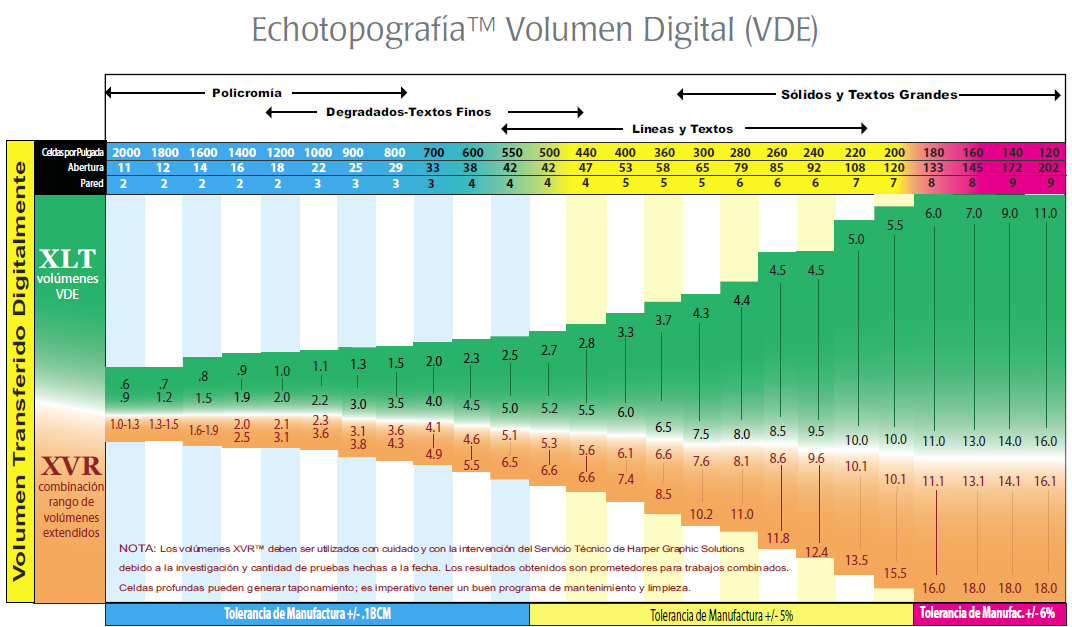 La siguiente tabla ayuda en la correcta selección del rodillo anilox, dependiendo del trabajo que se va a realizar.